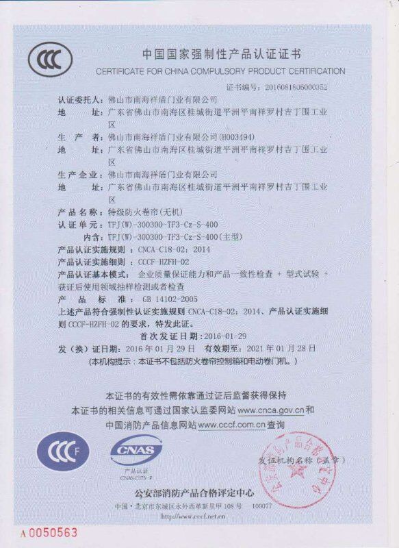 (特級防火卷簾)中國國家強制性產品認證證書